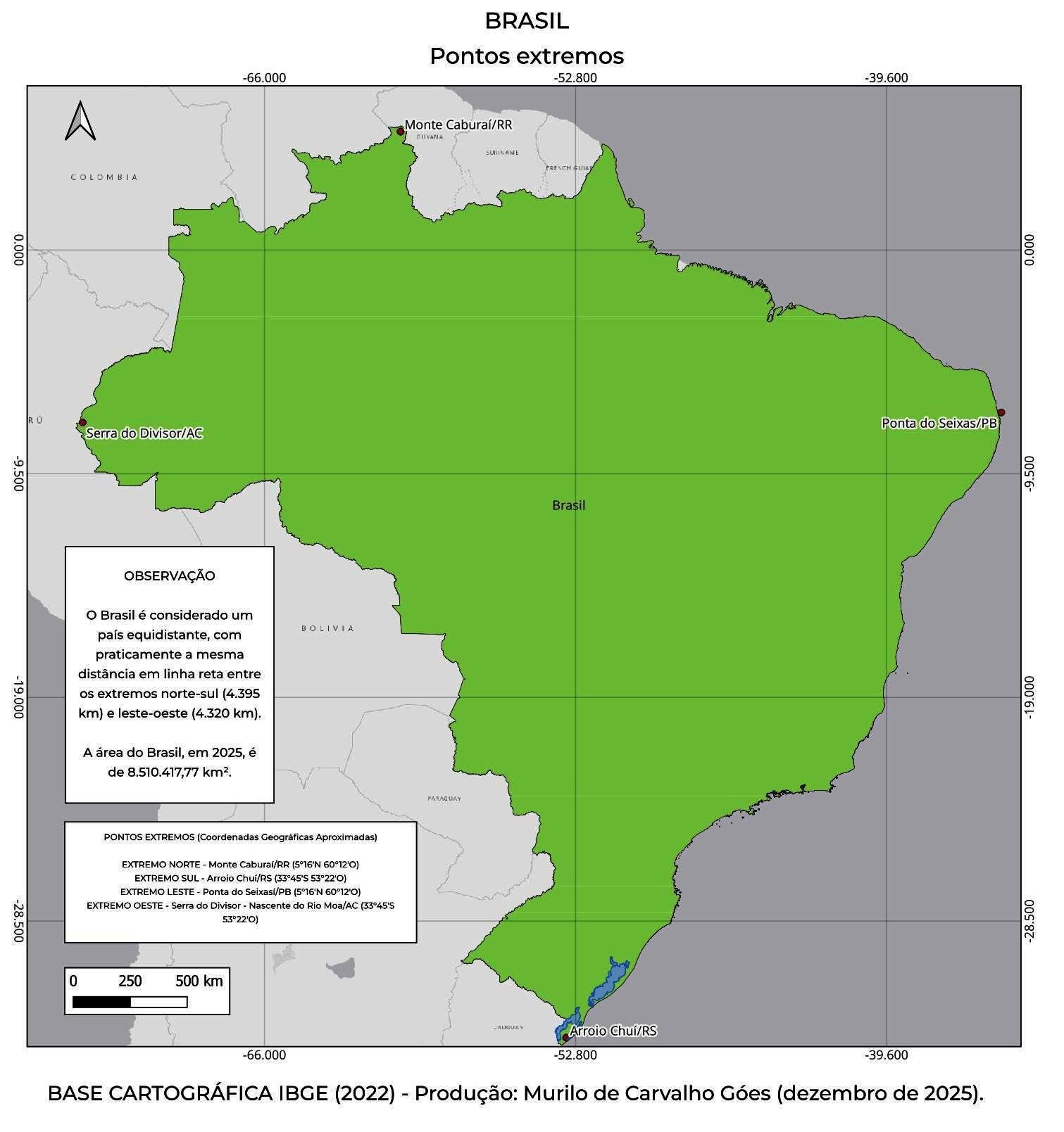Ao norte, o Brasil faz fronteira com a Colômbia, Venezuela, Guiana, Suriname e Guiana Francesa. A oeste, com o Peru, Bolívia e Paraguai. Ao sul, Argentina e Uruguai. E a leste, o Oceano Atlântico.